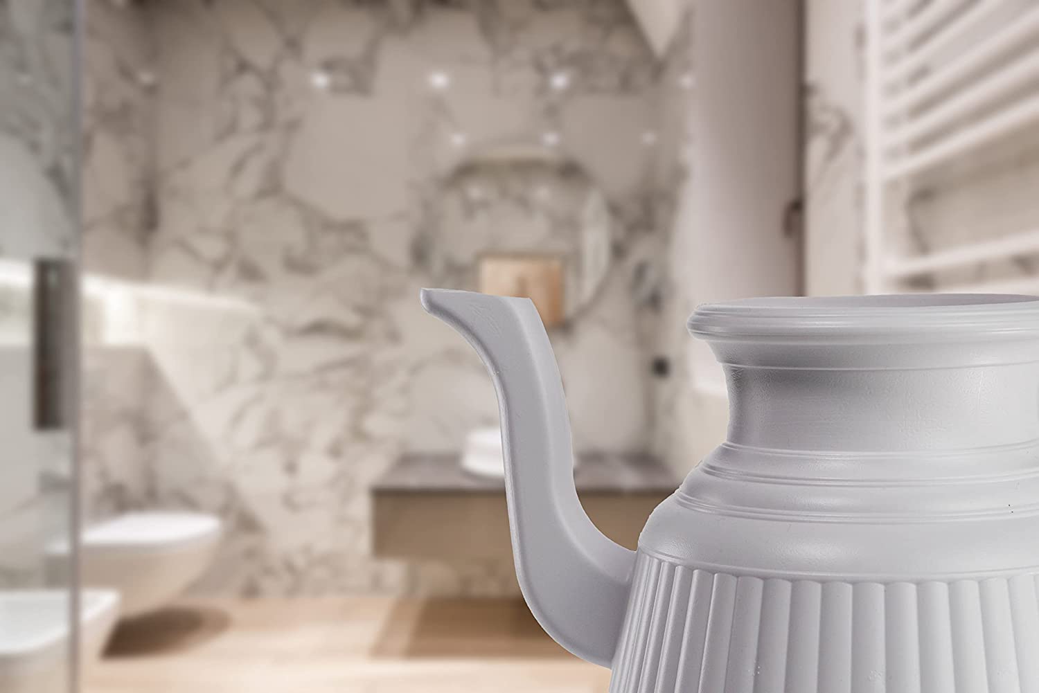 Easily fits under most bathroom taps for filling, has a grooved handle